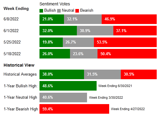 Alcista (Bullish) 21.0% < Bajista (Bearish 46.9%).